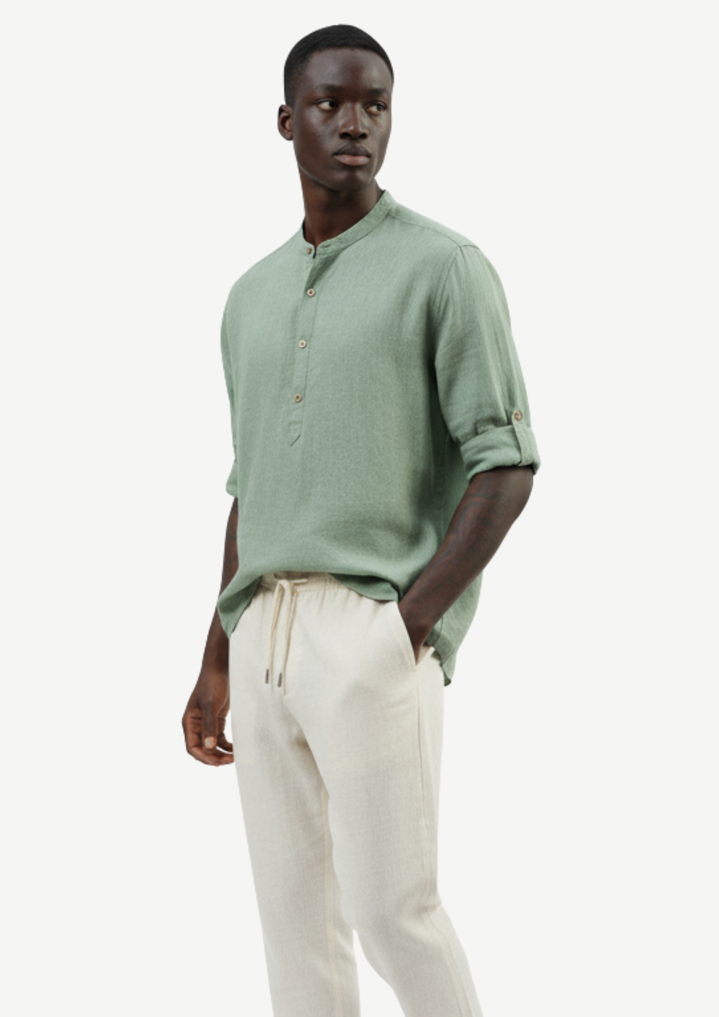 Het shirt met opstaande kraag en de rechte broek geven je look direct een elegante, bijna mediterrane vibe. Perfect voor vakantie, een chic terras of een dag op het water.